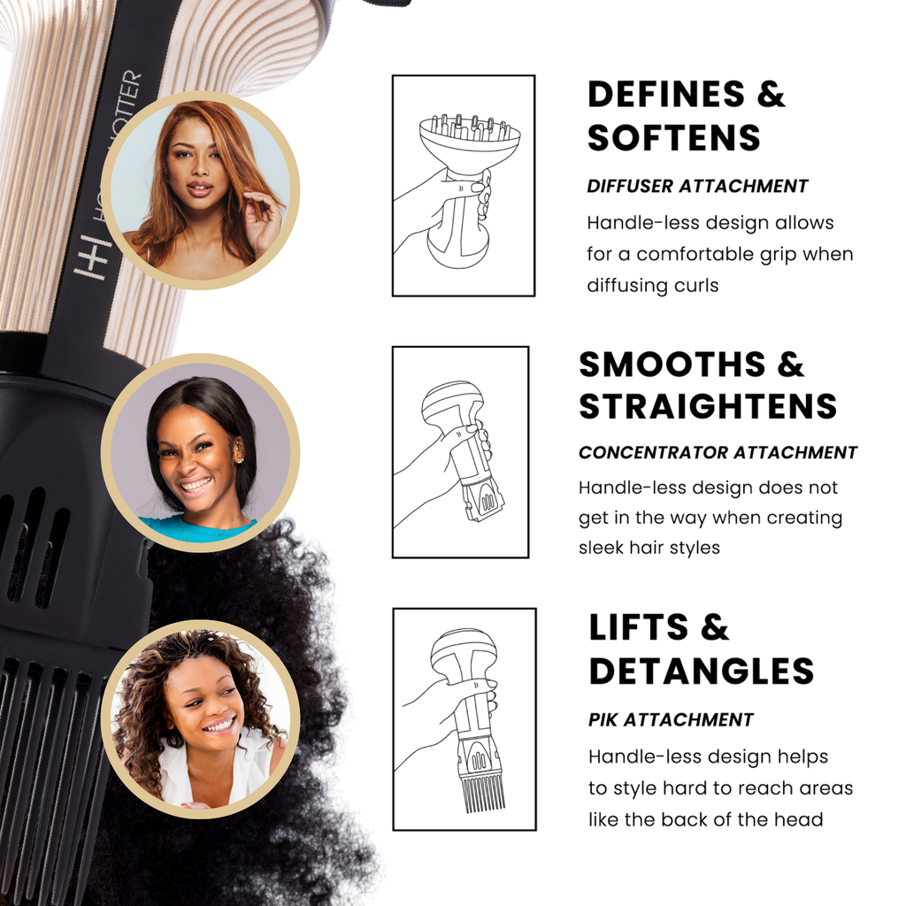 Introducing the Hot & Hotter Turbo 4000 Ceramic Handle-less Hair Dryer in luxurious Gold! Perfect for professionals and home-users alike, this compact powerhouse redefines convenience. Its innovative handle-less design makes reaching tricky spots a breeze, while the 2-in-1 pik attachment effortlessly switches from concentrator to pik. Enjoy frizz-free styles with ceramic ionic technology, and customize your look with three versatile speed and temperature settings. Lightweight, travel-friendly, and oh-so-chic!